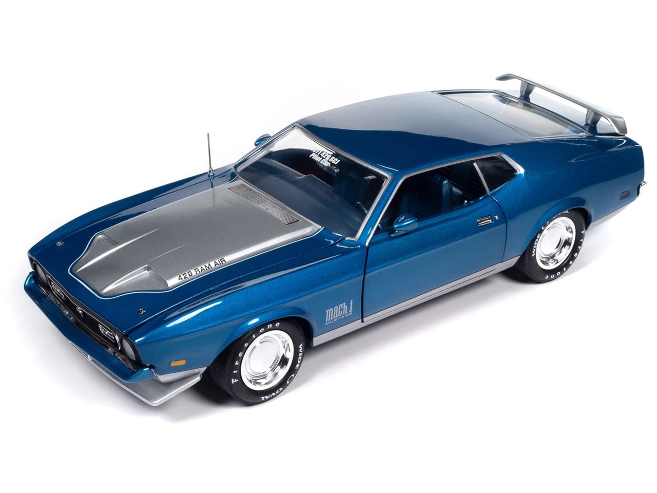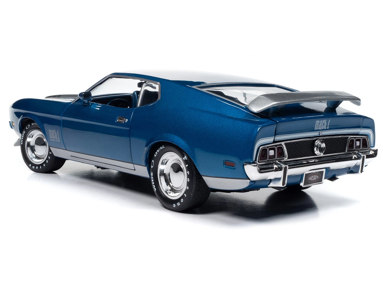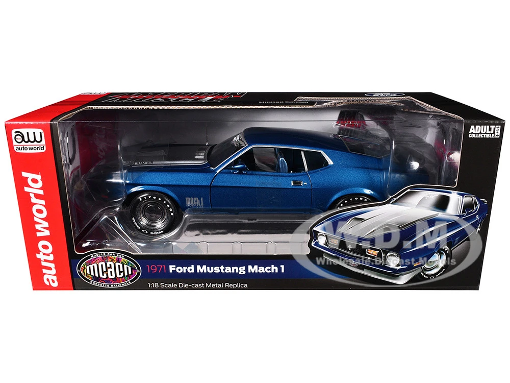 - Brand new 1/18 scale diecast car model of 1971 Ford Mustang Mach 1 Blue Metallic with Silver Hood “Muscle Car & Corvette Nationals” (MCACN) “American Muscle” Series die cast model car by Auto World.