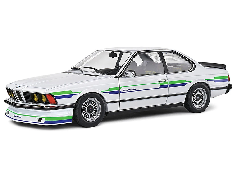 - Brand new 1/18 scale diecast car model of 1984 BMW Alpina B7 Turbo (E24) White with Blue and Green Graphics die cast model car by Solido.