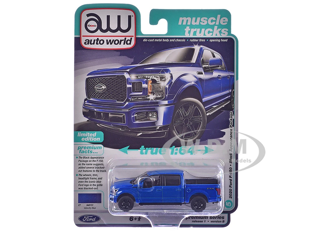 - Brand new 1/64 scale diecast car model of 2020 Ford F-150 FX4 Black Appearance Package Pickup Truck Velocity Blue “Muscle Trucks” Series die cast model car by Auto World.