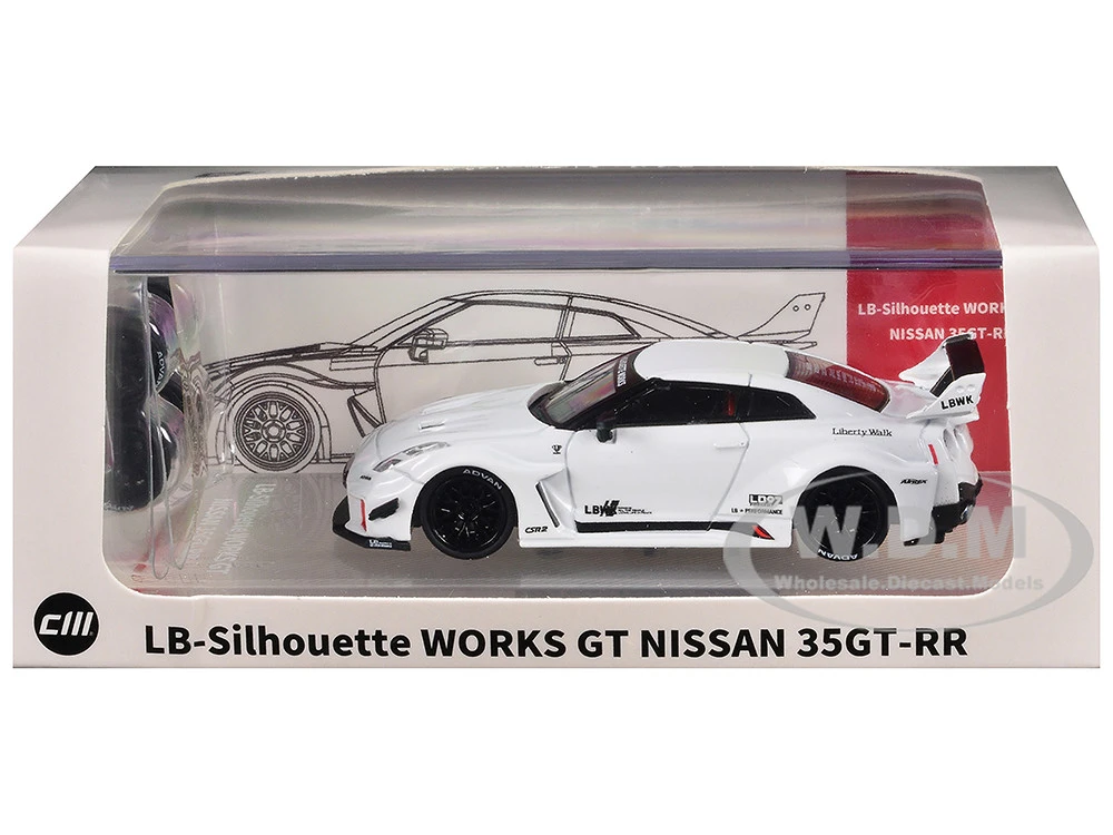 - Brand new 1/64 scale diecast car model of Nissan 35GT-RR “LB-Silhouette Works GT” RHD (Right Hand Drive) White with Extra Wheels die cast model car by CM Model.