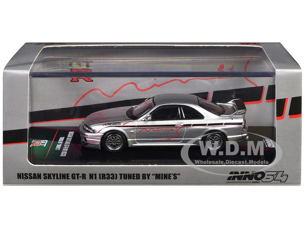 - Brand new 1/64 scale diecast car model of Nissan Skyline GT-R N1 (R33) RHD (Right Hand Drive) “Tuned by Mine’s” Silver Metallic die cast model car by Inno Models.