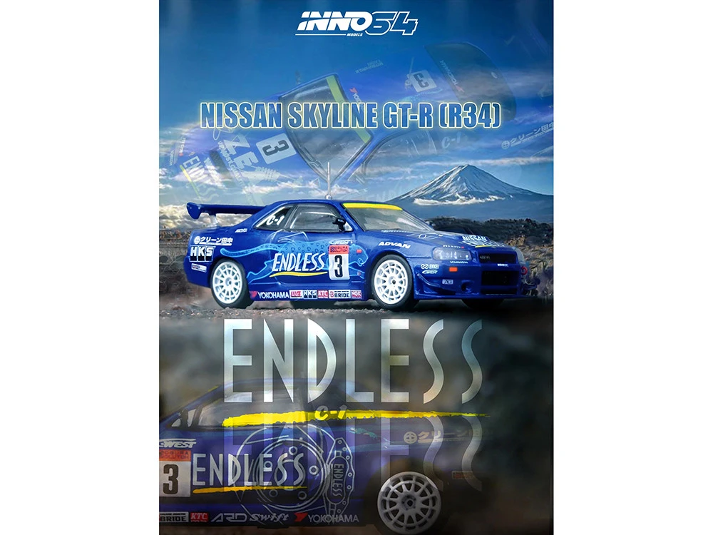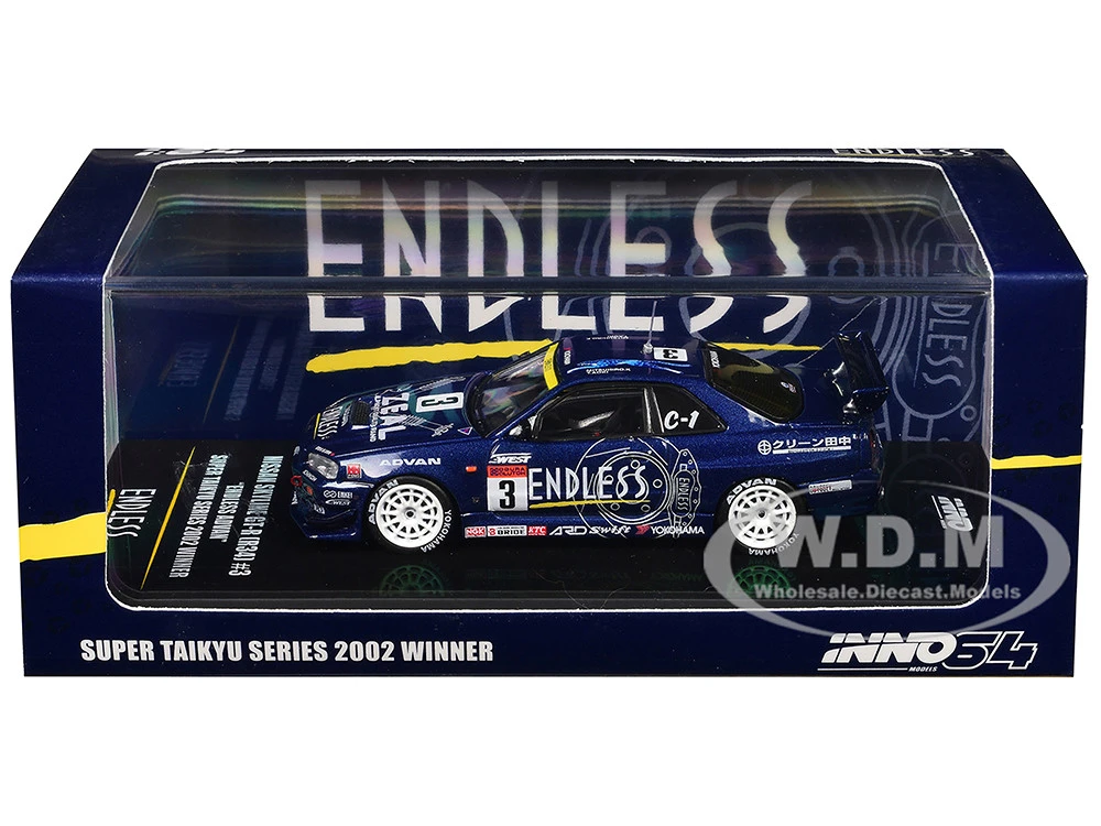 - Brand new 1/64 scale diecast car model of Nissan Skyline GT-R (R34) RHD (Right Hand Drive) #3 “Endless Advan” Winner “Super Taikyu Series” (2002) die cast model car by Inno Models.