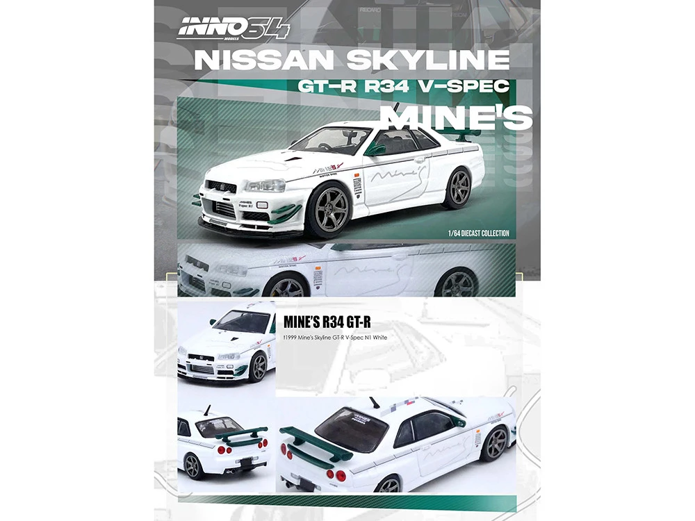 - Brand new 1/64 scale diecast car model of Nissan Skyline GT-R (R34) V-SPEC N1 RHD (Right Hand Drive) “Tuned by Mine’s” White die cast model car by Inno Models.