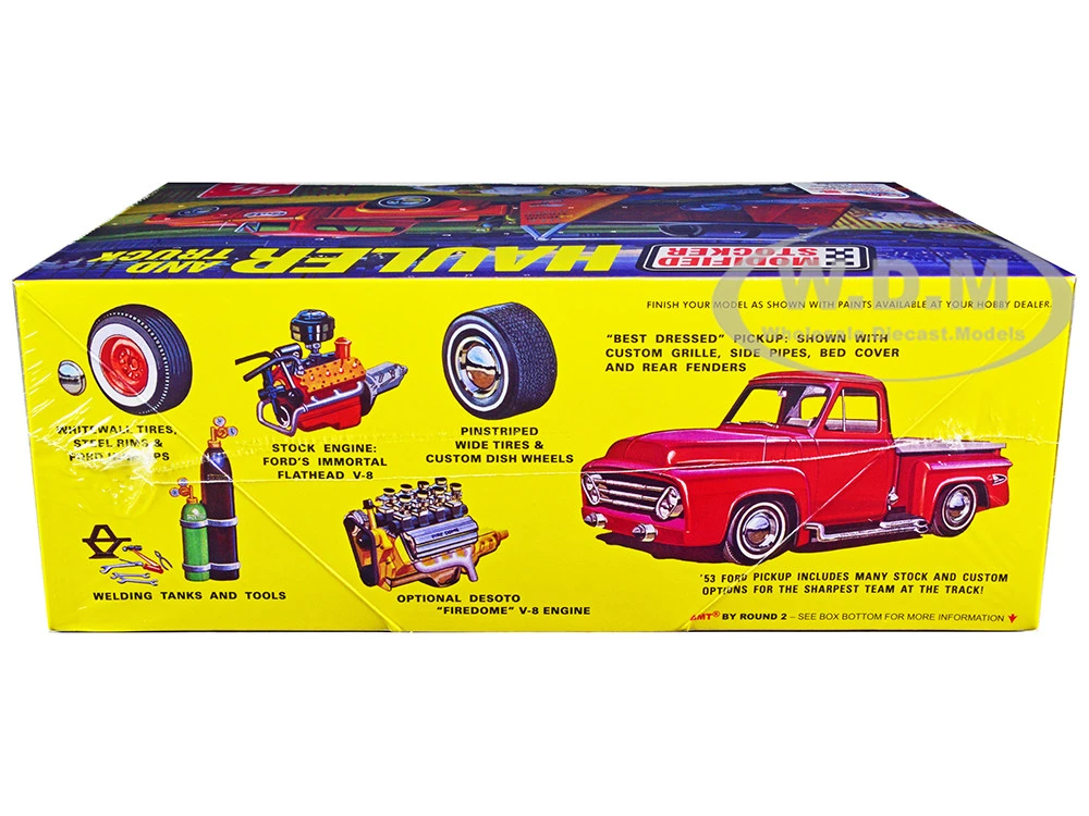 - Brand new plastic model kit of 1953 Ford Pickup Truck with “Modified Stocker” Hauler “Gulf Oil” (Skill 2) 1/25 plastic model kit by AMT.